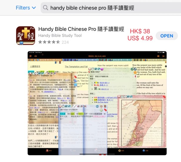 介紹一個功能十分強大的聖經App(Handy Bible Chinese Pro),它提供很多版本的中/英文聖經(一些需要另外購買)並很強大的搜索與筆記編輯功能,對於想深入研經的人很有幫助。這個App的開發者是居於北美的華人,他很有心的不斷改進這App並願意聆聽用家的意見,十分值得支持。