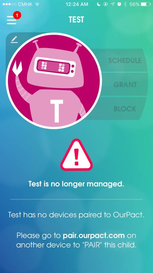 如果孩子自行刪除OURPACT的管理設定(其實不容易找到,但年紀大一點的孩子可能可以做到),但家長端會馬上收到通知: