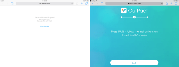 在孩子的iPad上打開Safari,輸入網址:pair.ourpact.com,如果按第一篇的設定應該會被封鎖,按Allow Website後輸入密碼便能進入。