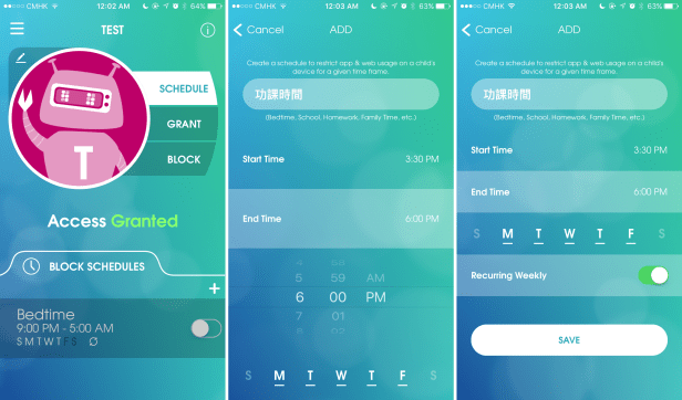 – SCHEDULE(按日程編排):家長可以此設定孩子的iPad在什麼的時間會進入「禁制」模式,例如可設定睡眠的時間,做功課的時間等等。可設定禁制只限在星期一至五或是週六、日某些時間等