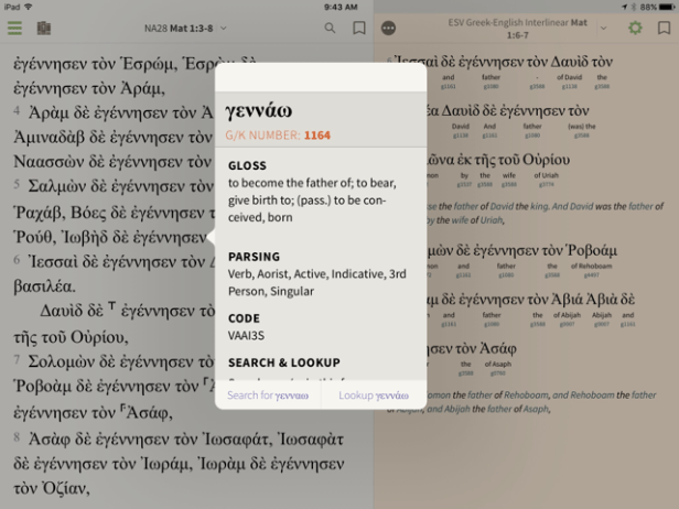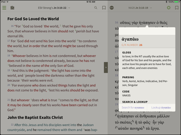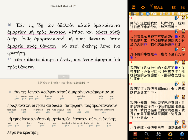 答:筆者試用過LogosAccordanceOlivetree,當中最多原文資源的是Logos;Accordance在iOS中可以使用的資源很少;而Olivetree雖然現階段擁有的原文資源不及Logos(如還沒有舊約希伯來文/英文的Interlinear聖經),但其使用是最方便的,不像Logos要透過幾個步驟才能查考原文字詞,也不需要上網就能搜尋原文及其解釋,所以是筆者認為最值得推介的原文聖經閱讀App。