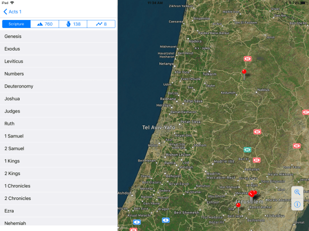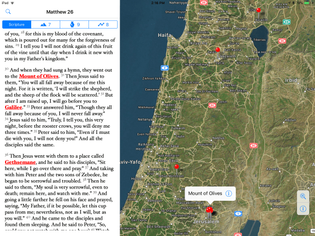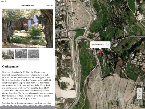 本程式的內容十分豐富,提供了很多聖經有關的考古地點、文物等資料與圖片。程序內置了一本英文聖經ESV譯本(English Standard Version),並預設了打開”Acts 1”(使徒行傳第一章)。所有在當前選擇經文內提及的地方都會顯示在右方的地圖內,再點選該地方ℹ️便會出現詳細的資料。