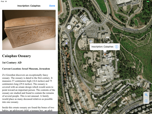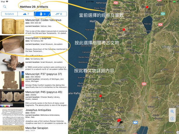按Done返回先前頁面,再按第三個按鈕(花瓶的形狀),顯示該章相關的考古文物(例如選擇「該亞法」的骨盒):