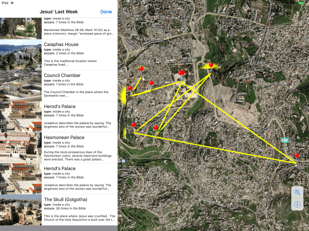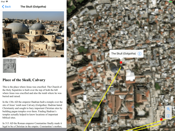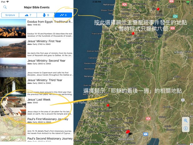 本程式提供了八個聖經主要事件的發生地點,只要按第四個按鈕(路徑的形狀)便可選擇;如選擇「耶穌的最後一週」,再選擇當中的「各各他」:
