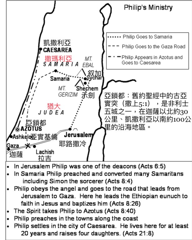 七個執事之一的腓利(徒6:5、8:4、8:26-40、21:8-9)。從8:40記載他傳福音到了凱撒利亞至這時他已經有四個女兒了。這裡記載了女性中也有人得到聖靈的恩賜。