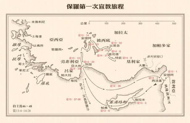 「安提阿」(Antioch)。是敍利亞(Syria)的城市(非彼西底的安提阿),也是保羅第一次佈道旅程的起點(13:1-4)。這次佈道旅程在此結束,全程約有2,240公里(1,400英里)。