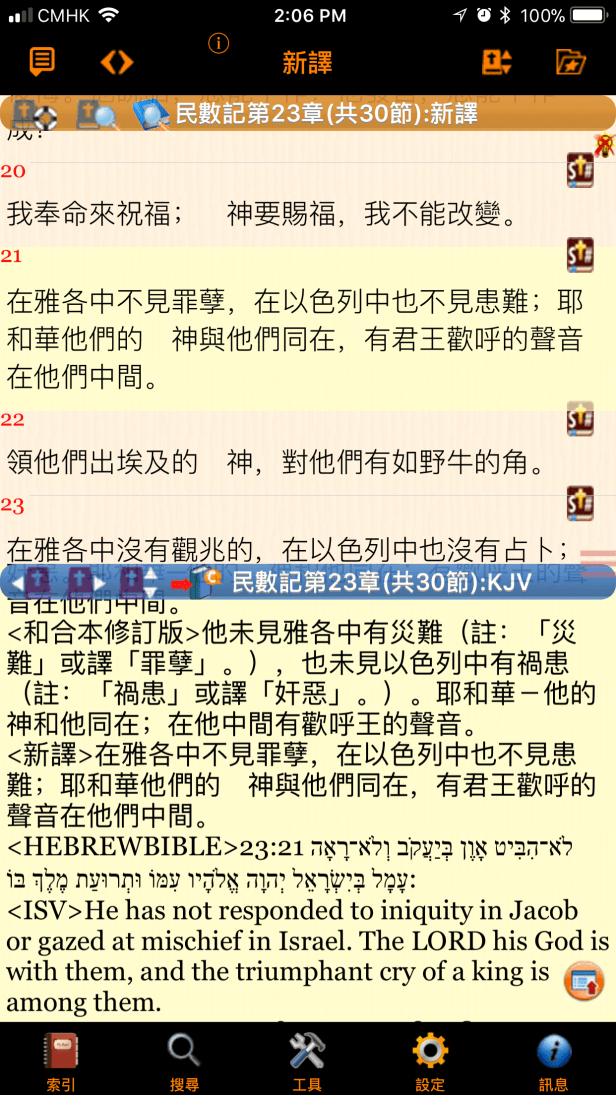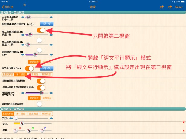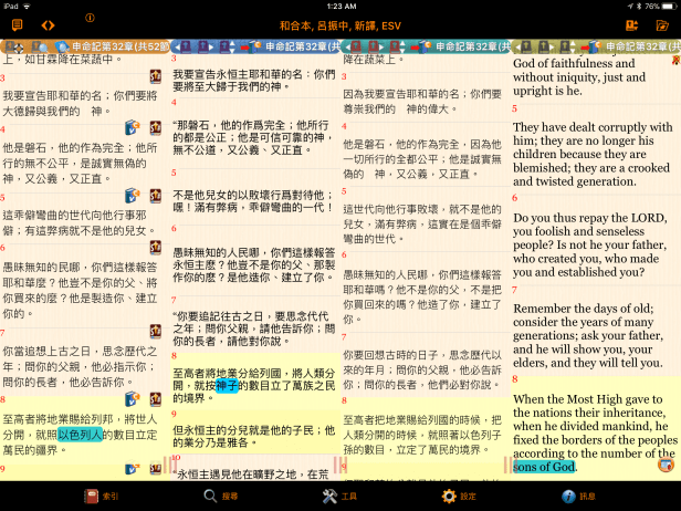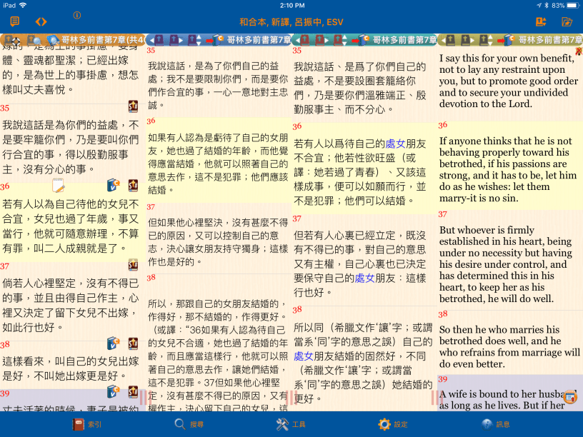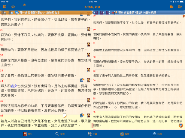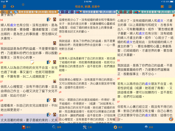 相較多視窗模式,筆者比較喜歡只是用雙視窗模式(特別在iPhone中較小的屏幕時)。在主視窗使用常用的譯本,但在第二視窗設定使用「經文平行顯示」模式。這樣,一般情況只需留心第一視窗中的經文,有需要則可以同時看多個譯本的翻譯: