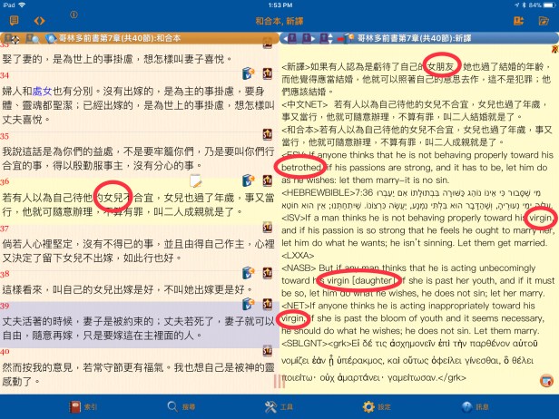 還有,比較譯本也可以幫助讀者從不同角度去理解經文,因為翻譯過程中譯者需要考慮上文下理,例如在哥林多前書7:36-38中對原文παρθένον就有不同的翻譯:《和合本》:「女兒」;《新譯本》:「女朋友」;ESV: “betrothed“;ISV, NET: virgin, NASB: virgin daughter: