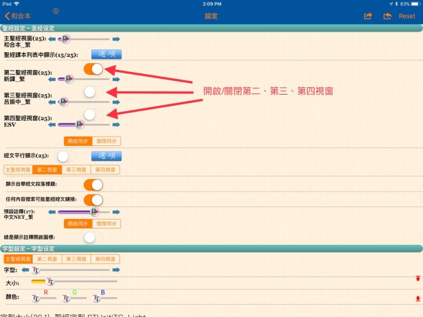 Handy Bible Chinese Pro提供最多四個並排視窗作同時比較譯本之用,透過更改「設定」便可以開啟/關閉: