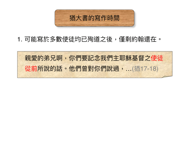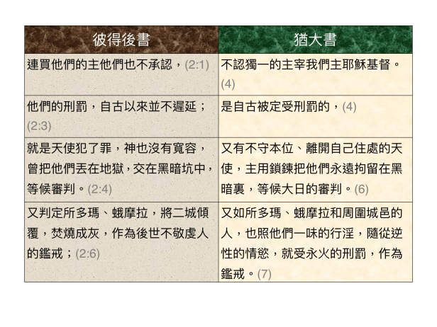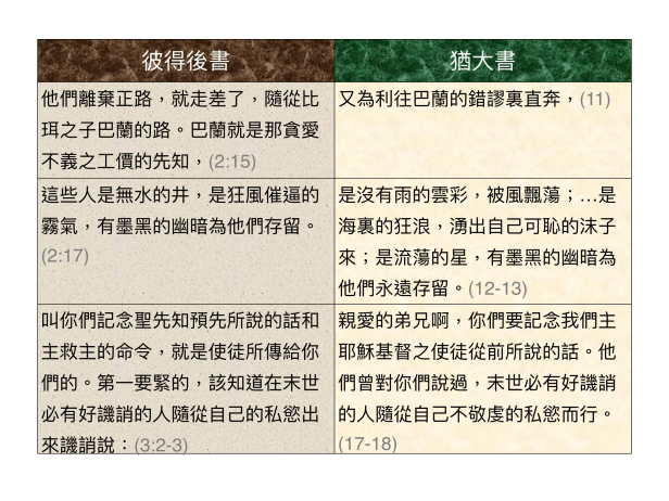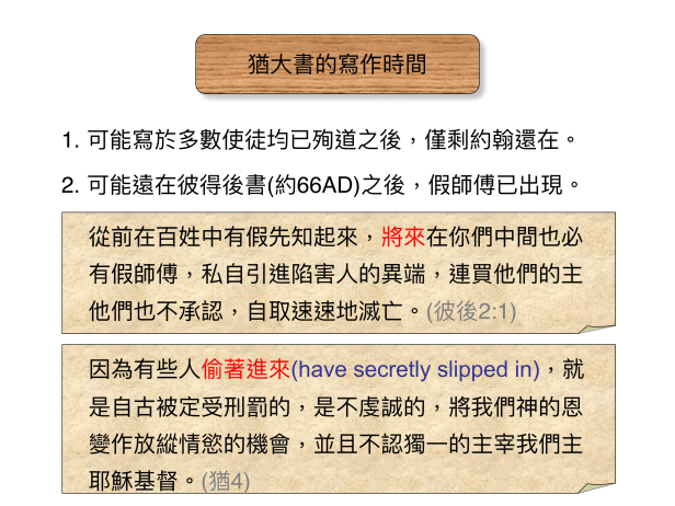 研經資料 《猶大書》研經資料 Date: 07/11/2018Author: Henry Au 0 留言 本篇將提供有關《猶大書》的研經資料,沒有註明出處的是筆者的註釋,並會不時作出更新:(最後更新日期:2018年11月7日) 猶大書的簡介(來源:The Bible Project) 全書綜覽: 背景資料: 諾斯底主義 有關聖經正典、旁經、偽經 猶大書與彼得後書的相似的處 (圖片來源:BiblePoint) 第一章 若你有其他有關聖經或信仰的問題,可按這裡發問。 分享此文: 按一下即可分享至 X(在新視窗中開啟) X 按一下以分享至 Facebook(在新視窗中開啟) Facebook 喜歡 正在載入... 相關