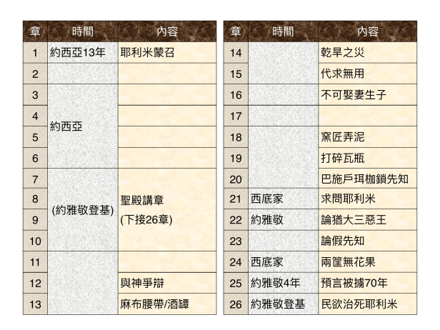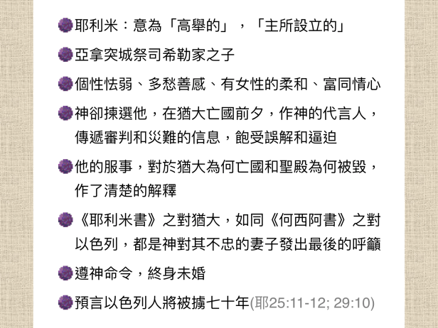 研經資料 《耶利米書》研經資料 Date: 07/11/2018Author: Henry Au 0 留言 本篇將提供有關《耶利米書》的研經資料,沒有註明出處的是筆者的註釋,並會不時作出更新:(最後更新日期:2018年11月7日) 書整卷書的簡介(來源:The Bible Project) 耶利米書大綱: 背景資料 (圖片來源:BiblePoint) 耶利米書每章簡介 (圖片來源:BiblePoint) 若你有其他有關聖經或信仰的問題,可按這裡發問。 分享此文: 按一下即可分享至 X(在新視窗中開啟) X 按一下以分享至 Facebook(在新視窗中開啟) Facebook 喜歡 正在載入... 相關