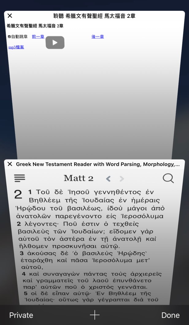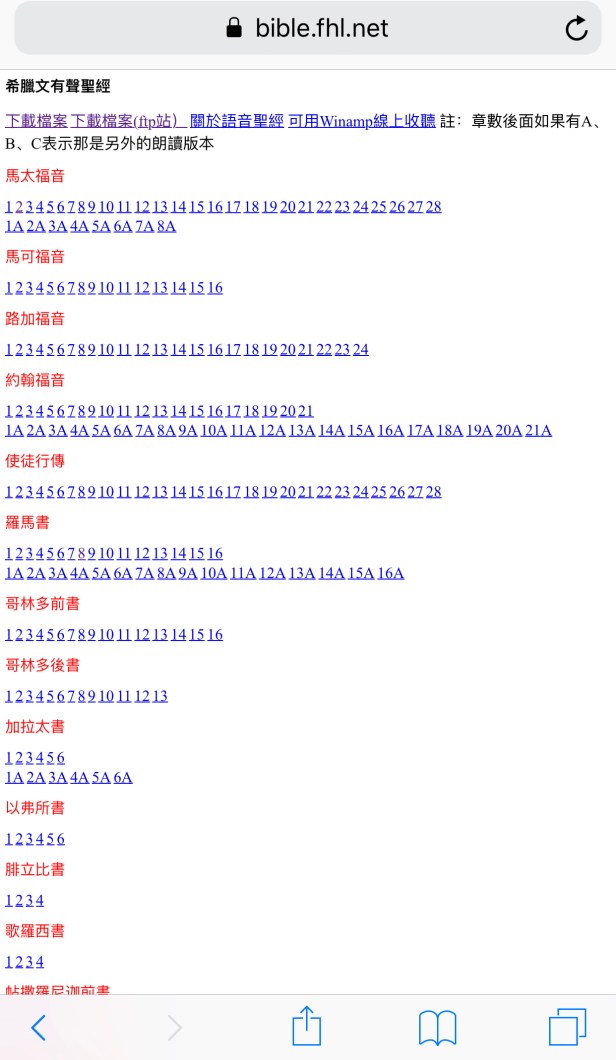 如果配合之前筆者介紹的「希臘文新約聖經」網站,便可以先打開經文視窗,再以另一視窗打開這個朗讀經文,對學習原文應該頗有幫助(眼到、耳到)。但缺點是本網站的朗讀速讀不能調整,筆者略嫌朗讀速度快了一點。